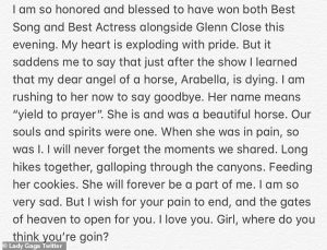 Por jo shumë kohë pasi doli nga skena pas fitores së saj më të mirë, Lady Gaga mësoi se kali i saj i dashur Arabella po vdiste.