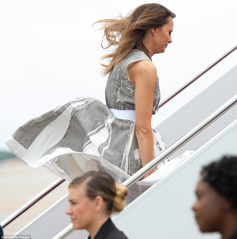 Melania Trump kalon një moment të sikletshëm, era i ngre fustanin teksa ngjitej në avion