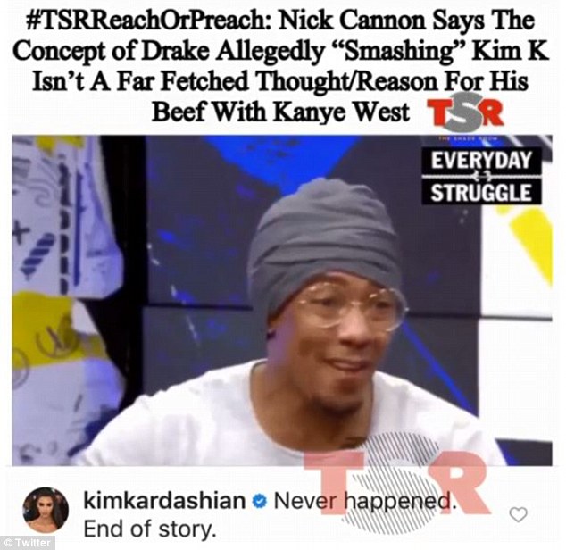 Nuk ka ndodhur kurrë. Fundi i kësaj historie”,komenton Kim në një nga lajmet e publikuara. Edhe burime për “TMZ” tregojnë se Kim nuk ka qënë asnjëherë e lidhur me Drake, para apo pas martesës.